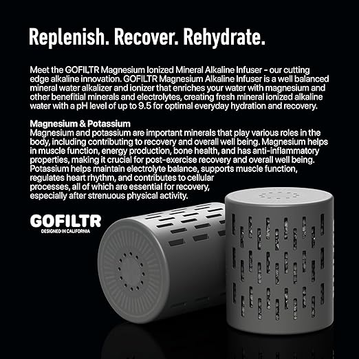 - REPLENISH, RECOVER, REHYDRATE - GOFILTR Magnesium Alkaline Infuser is a well balanced mineral water alkalizer and ionizer that enriches your water with magnesium, electrolytes and other beneficial minerals, creating fresh mineral ionized alkaline water with a pH level of up to 9.5 for optimal everyday hydration and recovery.