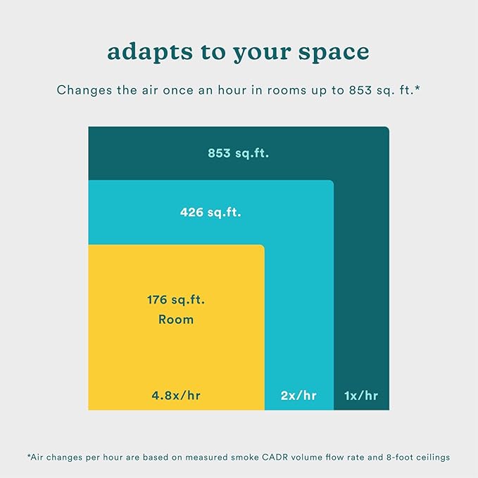 - Purify Medium Spaces: Great for bedrooms, home offices, and family rooms; cleans the air in a 176 sq. ft. room every 12.5 minutes or in an 853 sq. ft. room 1 time per hour; enhance your air by adding your favorite essential oils to the integrated tray