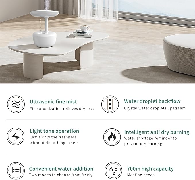 - 【Unique Design】The innovative design of our cool mist humidifier creates an anti-gravity visual effect, making the water droplets seem to flow upwards slowly, and adding a unique touch to your home or office. It has a full sense of technology and is perfect for reducing work pressure.