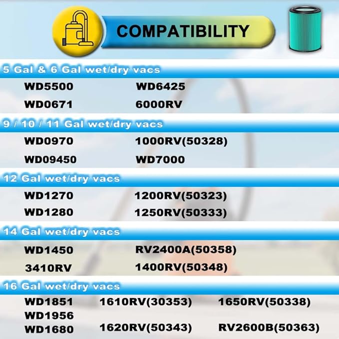 - COMPATIBILITY: Compatible with RIDGID vacs 5 gal. or larger, models # 5 Gallon: WD5500. // 6 Gallon: WD0671, WD6425, 6000RV(50308). // 9 Gallon: WD0970, WD09450. // 10 Gallon: 1000RV(50328). // 11 Gallon: WD7000. // 12 Gallon: WD1270, WD1280, 1200RV(50323), 1250RV(50333). // 14 Gallon: WD1450, 3410RV, RV2400A(50358), 1400RV(50348). // 16 Gallon: WD1851, WD1680, WD1956, RV2600B(50363), 1650RV(50338), 1620RV(50343), 1610RV(50353).