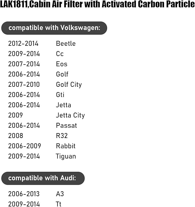 LAK1811,Cabin Air Filter with activated carbon particle for Volkswagen,2012-2014 Beetle,2009-2014 CC,2007-2014 Eos,Golf,Golf City,GTI,Jetta,Jetta City,Passat,R32,Rabbit.Audi,A3,TT.