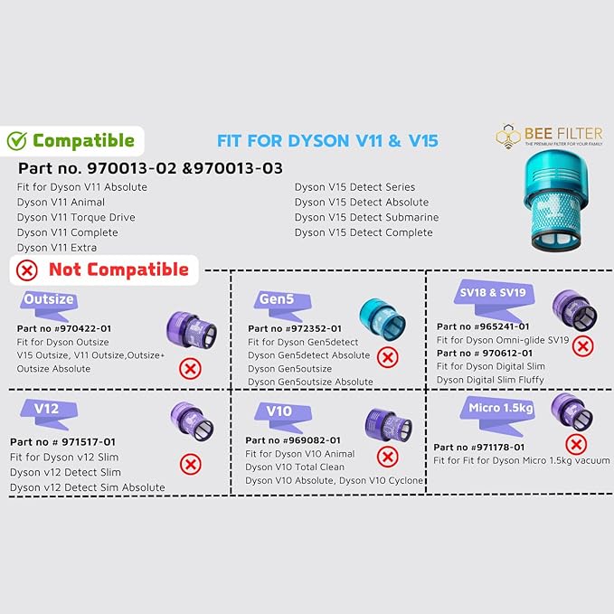 - ✅𝘾𝙤𝙢𝙥𝙖𝙧𝙚 𝙩𝙤 𝙋𝙖𝙧𝙩: Bee Filter Premium Filters Replacement for Part Number 970013-02 and 970013-03. These vacuum filters work well and fit your Dyson V15, Dyson V15 Detect, V15 Detect Absolute, V15 Detect+, Dyson V15 Filter, Dyson V15 Filter Replacement, Dyson V15 Detect Filter, Dyson V15 Detect Filter Replacement, Dyson V11 Filter Replacement, Dyson V11 Animal Filter Replacement, Dyson V11 Filter, Dyson V15s Detect Submarine, Dyson V11 Animal, Dyson V11 Torque Drive, Dyson V11, Dyson V11 Torque Drive Filter, Dyson V11 Complete, Dyson V11 Complete Filter, Dyson V11 Extra, Dyson v11 Extra Filter, Dyson v11 Absolute, Dyson V11 Absolute Filter, Dyson V11 Absolute Filter Replacement