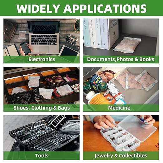 - Dessicant Packs Widely Used - Our desiccant packs for Storage are widely used in daily life, provide a better solution keep moisture from jewelry, clothes, shoes, bag storage, materials, tools, electronics, documents, books, seeds,etc. Place your items and silicone bags in sealed containers to protect them from moisture damage.