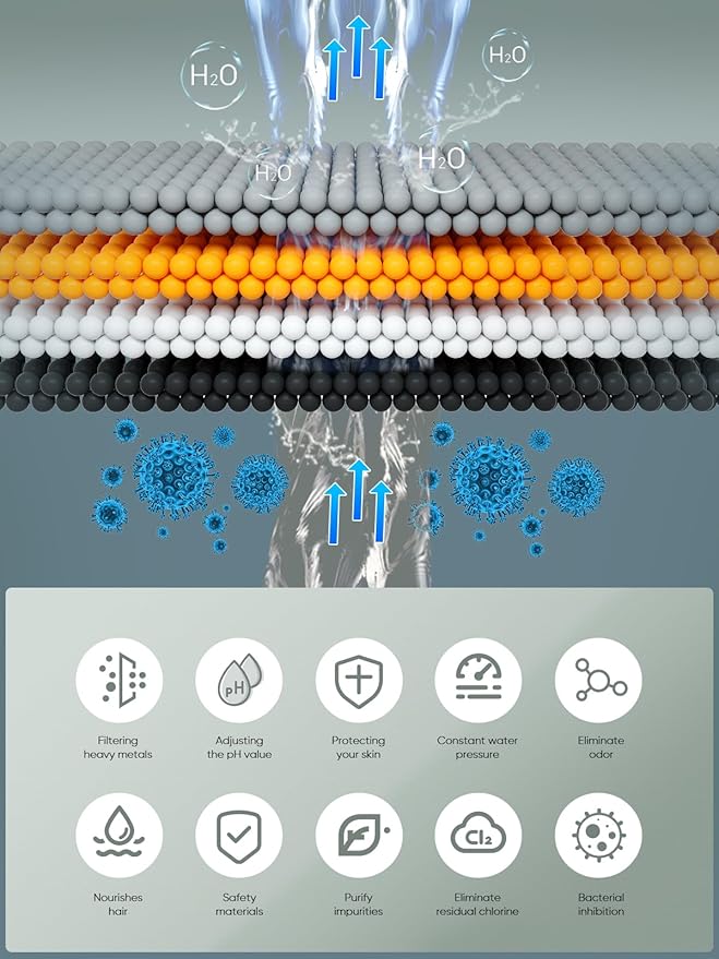 - 20-Stage Filtration: KDF55, alkaline ceramic balls, activated carbon, calcium sulfite and other filtration materials ensure optimal water purification. 20-stage filtration materials effectively reduce chlorine, heavy metals, rust, sand and other sediments, filter your water to neutralize odors and balance your pH level.
