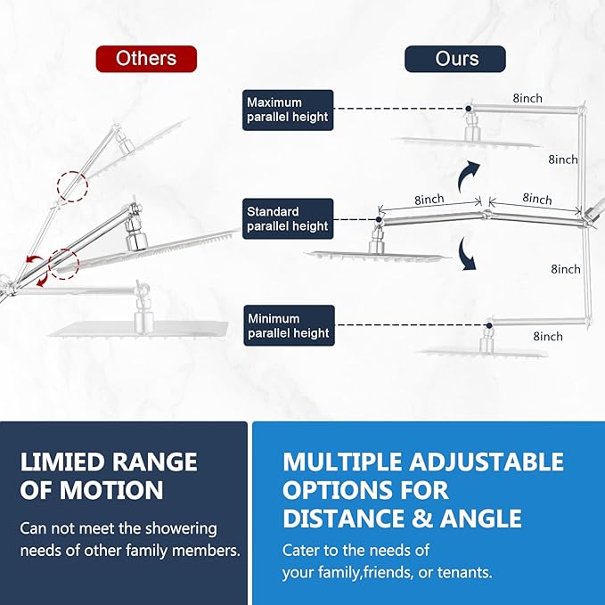 - 16 INCH BRASS SHOWER ARM: Vertical waterfall experience; 2-joint, 3-knob design for flexibility; Free-spin lock for level positioning; Built-in screws for stability