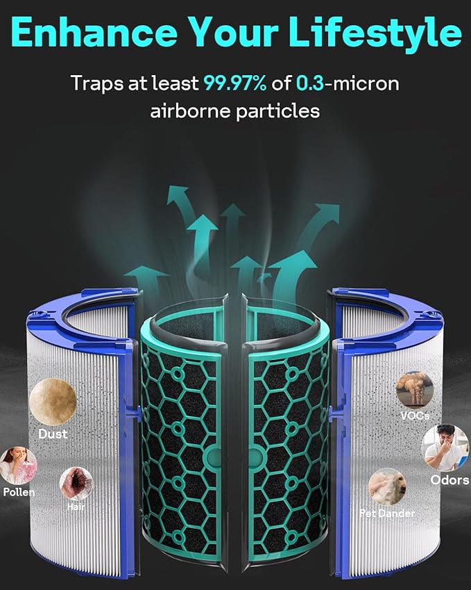 - 【PREMIUM FILTER】: This premium TP04 HP04 DP04 air filter replacement parts feature Dual-Layer Filtra-tion. The filter effectively captures a remarkable 99.97% of particles as small as 0.3 microns. The activated carbon filter efficiently cleans household odors from smoking, pets, and cooking fumes