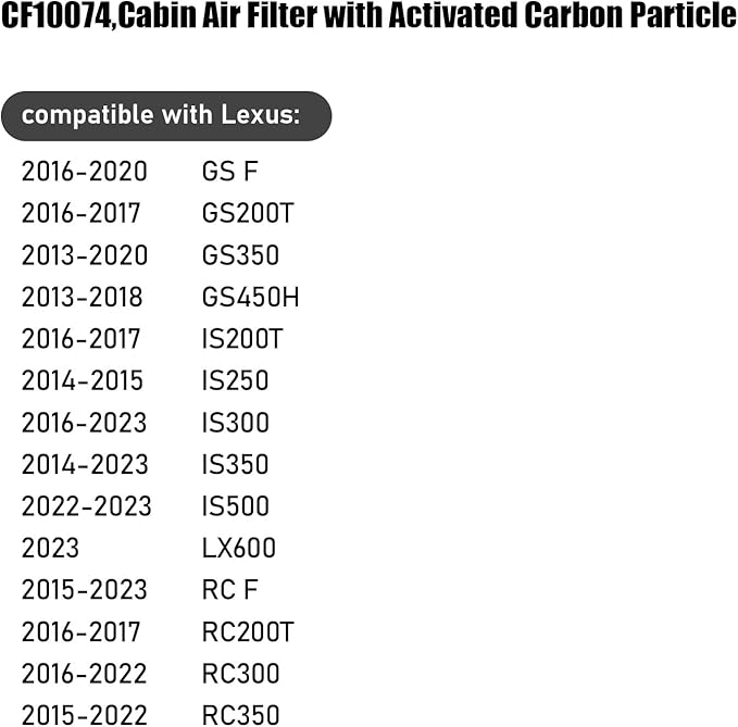 CF10074,Cabin Air Filter with activated carbon particle for Lexus,2016-2020 GS F,2016-2017 GS200T,2013-2020 GS350,2013-2018 GS450H,IS200T,IS250,IS300,IS350,IS500,LX600,RC F,RC200T,RC300,RC350.