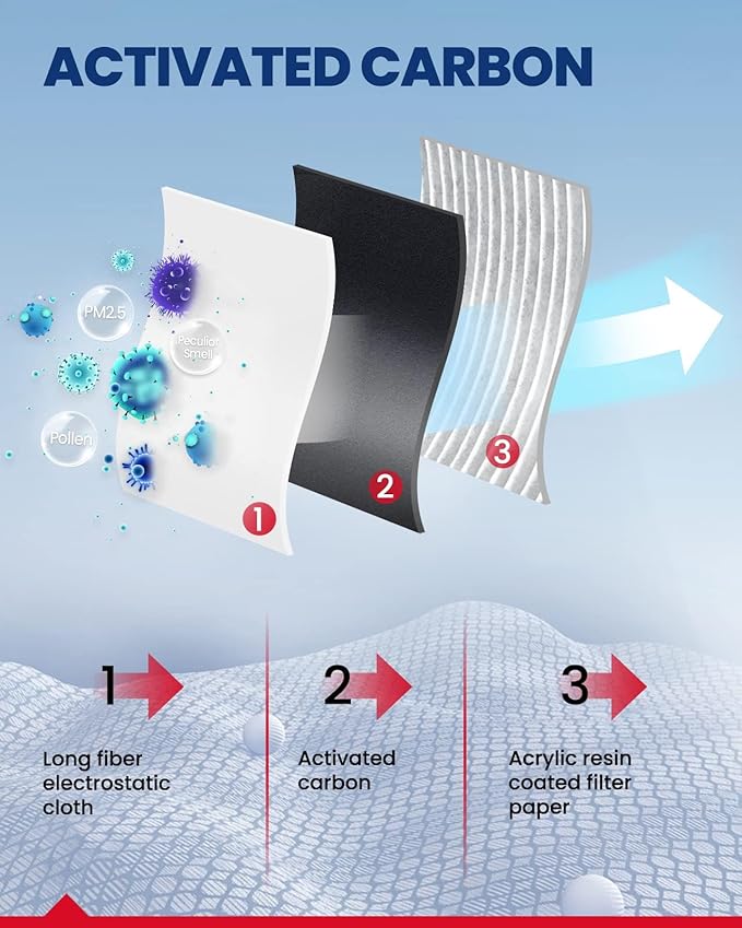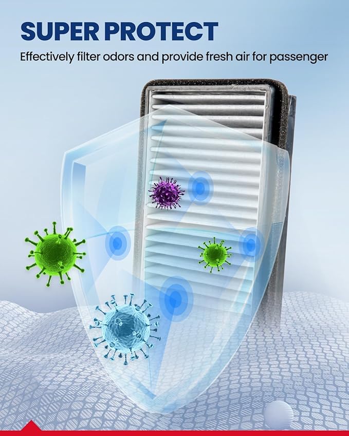 - 99.9% Filtration Efficiency: KAX cabin air filters are comprised of 5 layers that provide up to 99.9% filtration, that effectively captures small particles of 0.1-0.3 microns like dust, soot, pollen and other air pollutants,keep it from entering the vehicle, providing you with a comfortable interior environment
