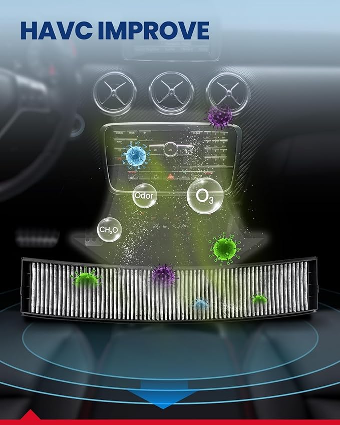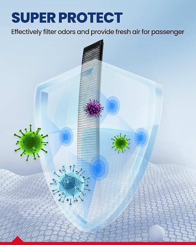 - 99.9% Filtration Efficiency: KAX cabin air filters are comprised of 5 layers that provide up to 99.9% filtration, that effectively captures small particles of 0.1-0.3 microns like dust, soot, pollen and other air pollutants,keep it from entering the vehicle, providing you with a comfortable interior environment