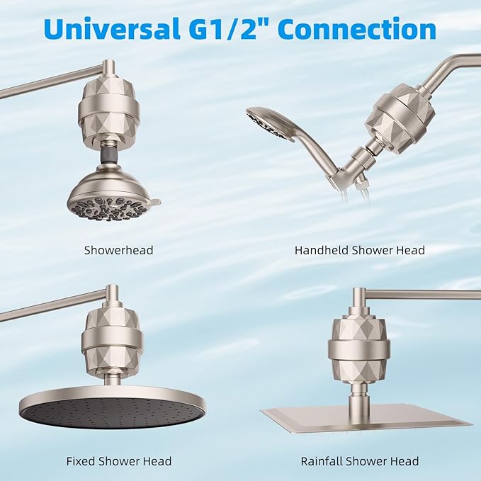 - Full Compatibility: Featuring universal G1/2" threads, our shower filters fit onto any standard shower pipe, arm, or extender. Experience effortless installation with our universal shower filters, which can be easily placed on wall-mounted, handheld, rainfall, and combo shower heads for versatile home use. Safeguard your entire household by effectively filtering out dirty water from every shower!