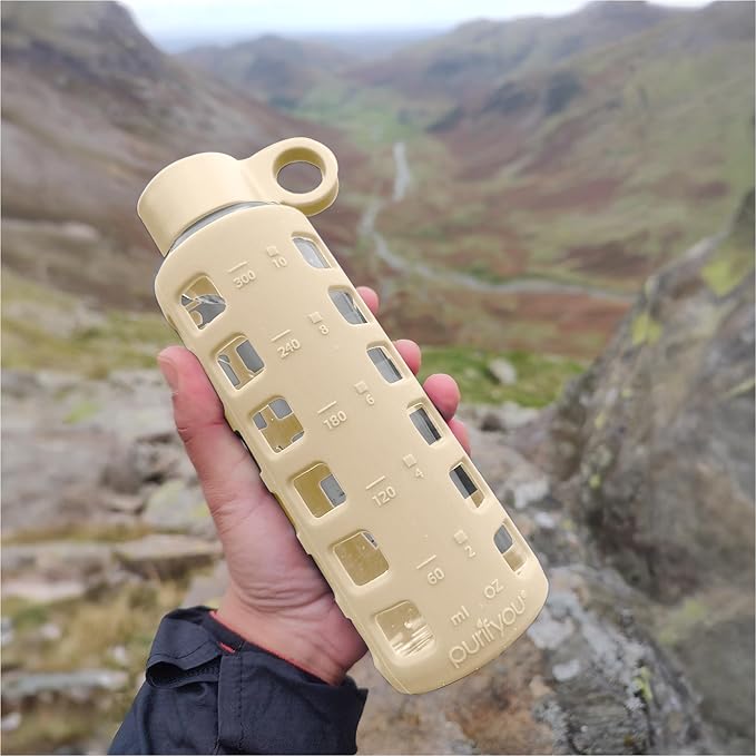 - Track & Improve Daily Hydration: Stay on top of your water goals with purifyou glass water bottles featuring clear, easy-to-read time and volume markings. Perfect for workouts, travel, the office, or relaxing at home.
