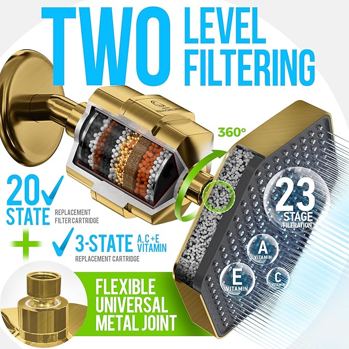 AquaHomeGroup Luxury Filtered Shower Head Set - 20 Stage Shower Filter for Hard Water, Chlorine, Fluoride, Heavy Metals - Water Filter Shower Head with Vitamin C E A Patent Pending (Golden)