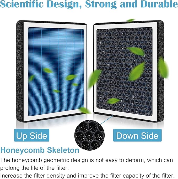 - 【Scientific Design, Strong and Durable】·HEPA Filter Layer,High Efficiency Particulate Air filter can effectively filter 99% of particles above 0.3 Microns.·Activated Carbon Filter,Strong adsorption capacity.Double layer filter design, clean air more thoroughly.Honeycomb Skeleton,The honeycomb geometric design is not easy to deform, which can prolong the life of the filter.
