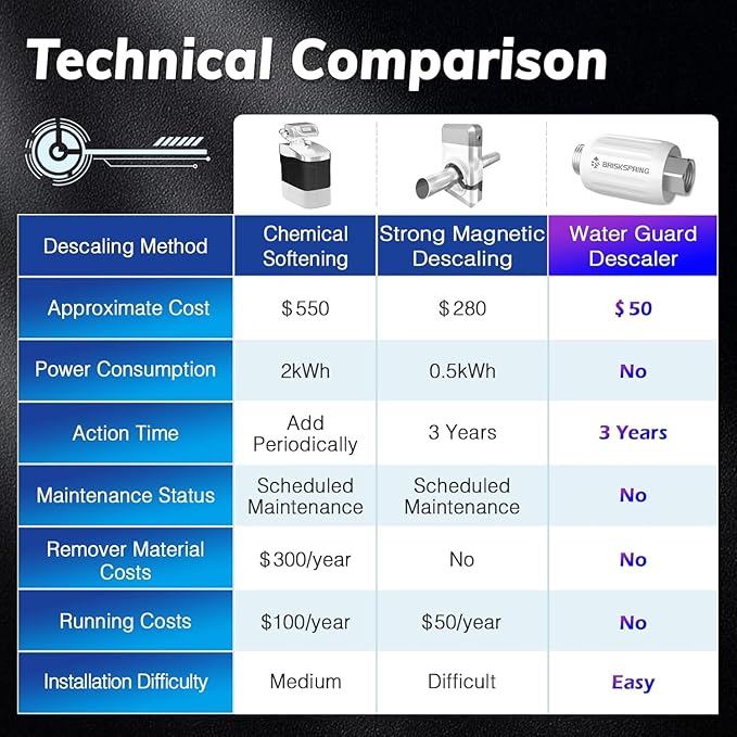- 【Physical Anti-Scaling & Softening】Special alloy anti-scale stuff, included in the water softener, can fundamentally inhibit limescale formation to provide healthy water by preventing calcium and magnesium ions from precipitating and combining. The surface tension of the fluid after the water descaler system is reduced, can dissolve the aged scale and achieve the purpose of descaling.