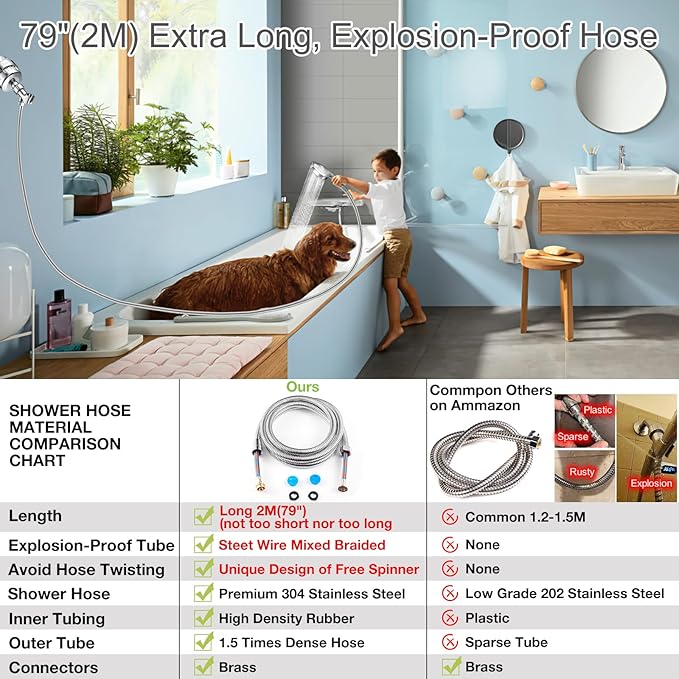 - 【79" (2m) Extral Long, Explosion-Proof Shower Hose】 comcon shower hose is only 59" (1.5m) with short lifespan plastic inner tube, while this hose is 79" (2m) Extral Long with the Steel Wire Mixed Braided Explosion-proof Structure Tube which can ensure shower more flexiblem and also long lifespan.