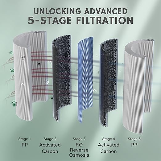 - ✅Against NSF/ANSI 58, 53, and 42 standards, as well as EPA 200, 300, and 537 regulations: Harnessing the power of a 5-stage filtration system—1 RO and 1 PCB—combined with PP - carbon - 0.0001 micron RO - carbon - PP, our system eradicates 99% of common tap water pollutants and impurities. This ensures your drinking water's safety while reducing the demand for bottled water.