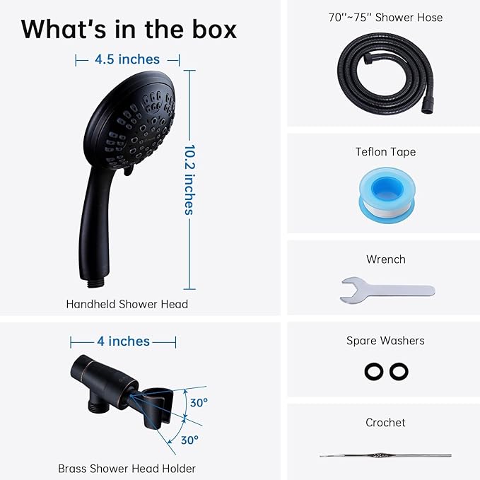 - PACKAGE INCLUDES: Handheld Shower Head, Brass Shower Head Holder, 70"~75" Shower Hose, Teflon Tape, Wrench, Crochet and Spare Washers