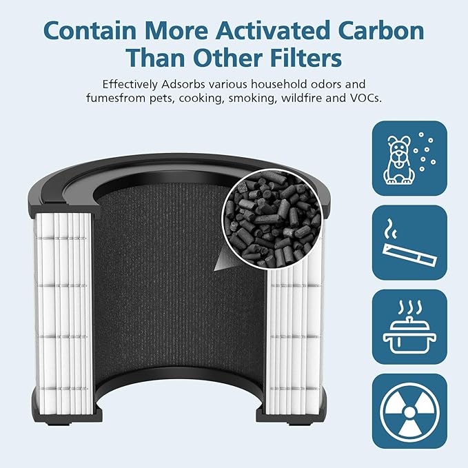 - PRE- FILTER & CARBON FILTER: Fine preliminary filter can filter large particles such as dust, lint, fibers, hair, and helping to extend the life of the HEPA filter; Upgraded high-efficiency carbon filter efficiently absorbs household odors and fumes from pets, cooking, smoke, wildfire.