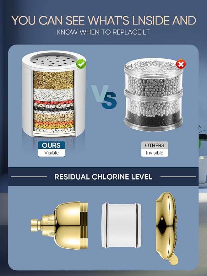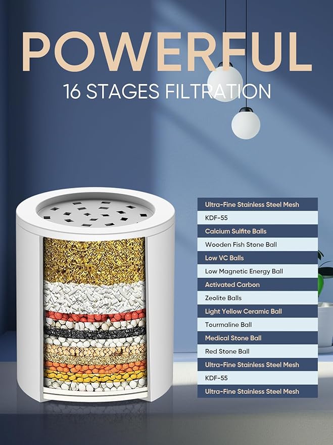 - 【16 Stage Shower Filter】16-stage filter adopts KDF-55, Calcium Sulfite, Vitamin C Balls, Acid-washed active carbon, Negative Ion Balls, Defluoride Particles and other filtering materials, ensure maximum reduction of Chlorine, heavy metals (lead, mercury, nickel, chromium) and other harmful substance in your shower water.Soften water quality, providing you with the cleanest and most comfortable water flow.
