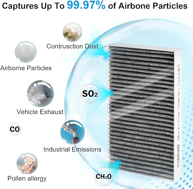 - Improved Air Quality: This cabin air filter with carbon activated, effectively filters fine particles, odors and harmful gases from the air, keeping your driving space fresh and comfortable at all times.