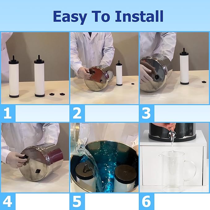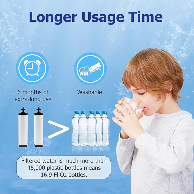 - 【Washable and Reusable】: The external ceramic filter is washable and reusable. The gravity filtration system does not require electricity and should be used regularly every day. The filter can keep your water delicious for at least six months. Please note that you have to totally submerge the carbon filter about once a week in order for the drip system to siphon properly.