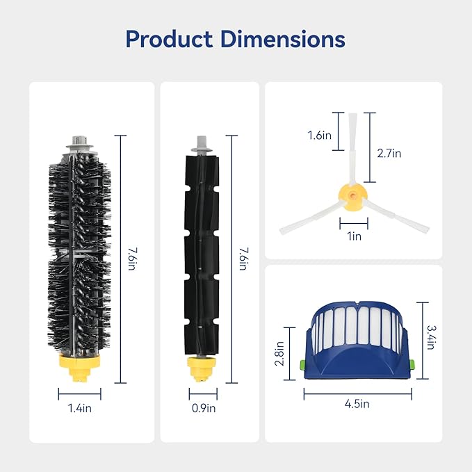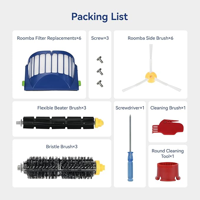 - COST EFFECTIVE PACKAGE: Pack contains 6 × Roomba filter replacements, 6 × Roomba side brushes, 3 × bristle brushes, 3 × flexible beater brushes, 3 × screws, 1 × screwdriver, 1 × cleaning brush, 1 × round cleaning tool. Great value combination for your daily needs. Never worry about dirty floors again