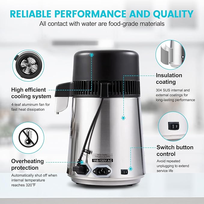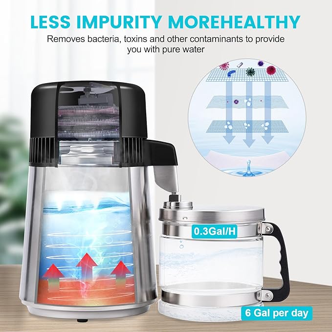 - [Convenient and Affordable] Fill the home water distiller machine, activate the switch, and just wait for the distilled water to be produced. This countertop water distiller can help you reduce dependence on single-use plastic bottles for drinking purposes,making it more conveniently obtain distilled water at home