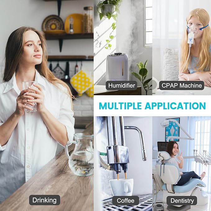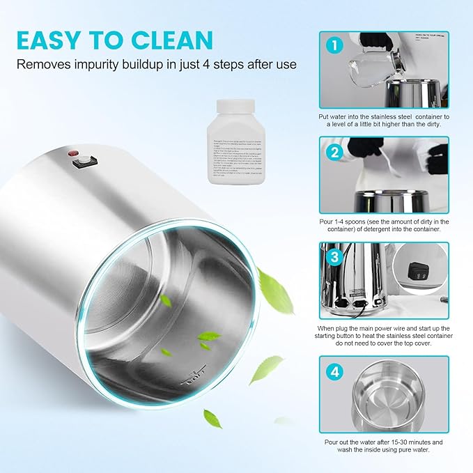 - [Easy to Maintain and Clean] The home distiller and container have large openings for easy maintenance. Using the included citric acid cleaner or white vinegar, you can easily clean the machine in just 4 steps by following the instruction guide. Meet the distilled water needs of different scenarios at home, clinics, laboratories and more