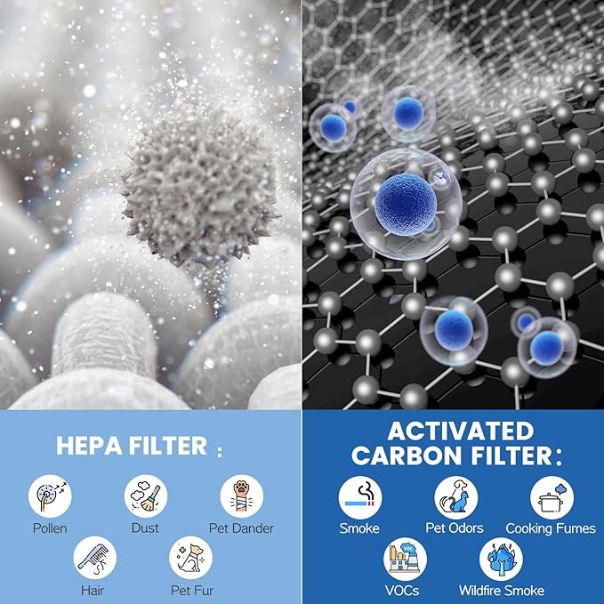 - 【4-IN-1 HEPA FILTER】: Our air purifier filter replacement use HEPA Filter, which is capable of attaching 99.7% of the airborne particles as small as 0.3 microns, and the activated carbon filter take in unpleasant odors and wildfire smoke