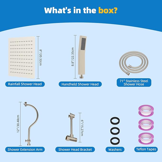 - Shower Head Combo: Hibbent shower combination comes with an 8'' rain shower head, handheld shower head, 71'' hose, 12'' extension arm, shower head bracket, washers, Teflon tape, and installation manual. The extra-long 71'' shower hose is made of odorless EPDM, stainless steel and brass material that can be used in a high-temperature environment