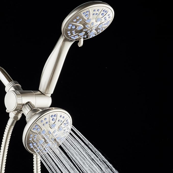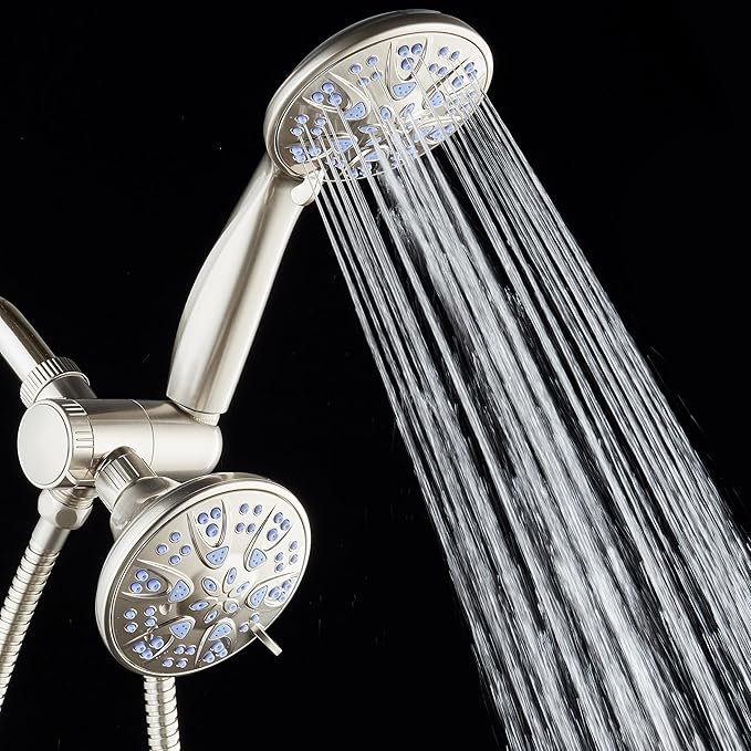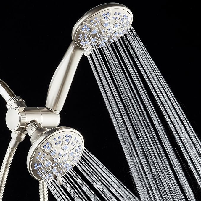 - 30-SETTINGS AND EASY INSTALLATION: Discover premium quality, high power, and cutting edge design. This combination shower features two separate shower heads, each delivering 6 unique settings for seemingly endless combinations: Power Rain, Pulsating Massage, Gentle Mist, Rain/Massage, Rain/Mist and Water-saving ON/OFF Pause. Includes angle-adjustable overhead bracket, stainless steel hose, Teflon plumber's tape and a Lifetime Warranty. Installation is easy and tool-free.