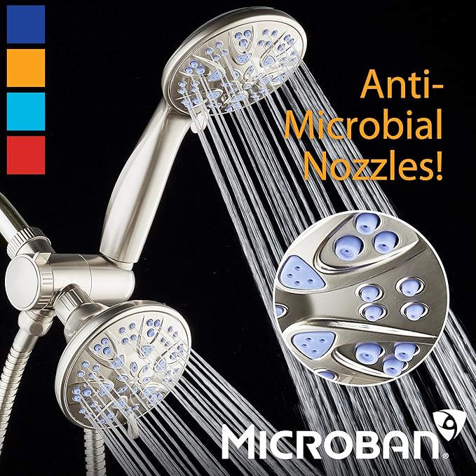 - ANTIMICROBIAL/ANTI-CLOG NOZZLES FOR LESS CLOGGING & BETTER WATER PRESSURE: Ordinary shower heads often lose water pressure due to clogging as blocked jet passages restrict water flow. Our shower nozzles are made with Revolutionary Antimicrobial Technology that inhibits the growth of Mold, Mildew and Bacteria. Their flexible rubber design allows for easy rub-clean removal of calcium and mineral deposits. This helps your shower head remain clean and clog-free for optimal performance.