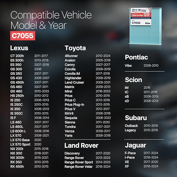 BNX TruFilter C7055 Cabin Air Filter, HEPA 99.97%, MADE IN USA, Compatible With Toyota Camry, Corolla, Highlander, RAV4, Tundra, Prius, 4Runner; Subaru Outback, Legacy; Lexus RX, GS, GX, IS, LS, ES