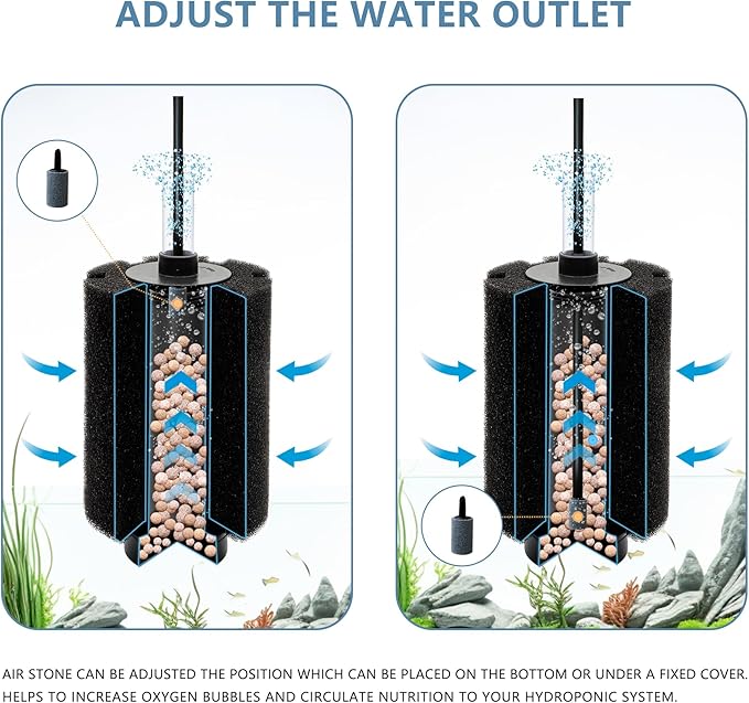 - 【Bubble Diffuser Design】The aquarium filter adopts air power and water circulation. The Air stones creates tiny bubbles, smooth water flow, and reduced noise, creating a quiet and comfortable environment for your aquatic pet.