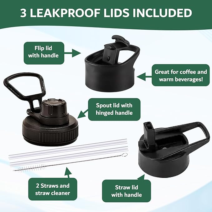 Travel Water Bottle with Carrying Bag, 3 Lids (Spout, Straw, Flip), and Bottle Brush; Leak Proof, Quality, Vacuum Insulated, Stainless Steel (Storm Cloud, 32 oz)