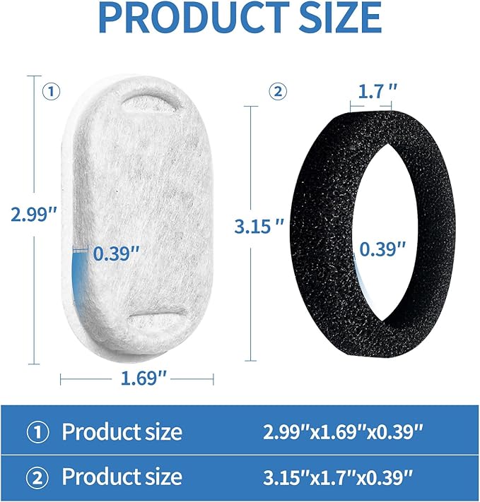 - The Filter Size: The cat water filter is 2.99 x 1.69 inches, sponge measures 3.15 x 1.1 inches and fits most cat fountains.
