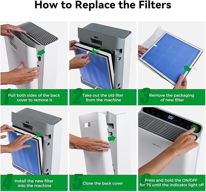 - How to Replace Filters: remove the plastic packaging from the new filter --- replace the filter --- restart the machine --- keep holding the power button --- until the filter replacement indicator disappears --- done!