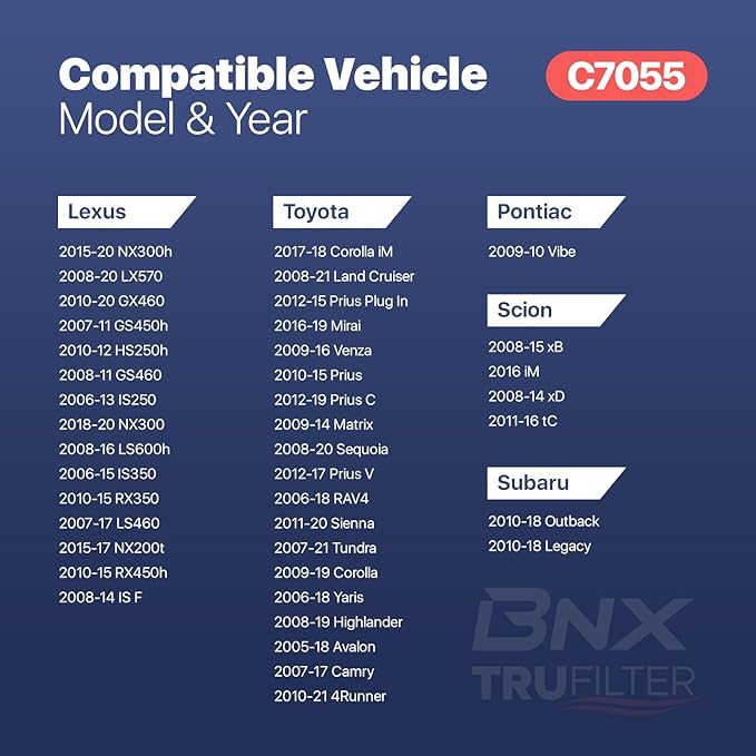 BNX TruFilter Premium HEPA Cabin Air Filter (Model C7055) Compatible With Lexus: RX, GS, GX, IS, LS, ES, Toyota: Tundra, Prius, Camry, 4Runner, Sienna, Highlander,Sequoia,Subaru:Outback, Legacy 2-Pack