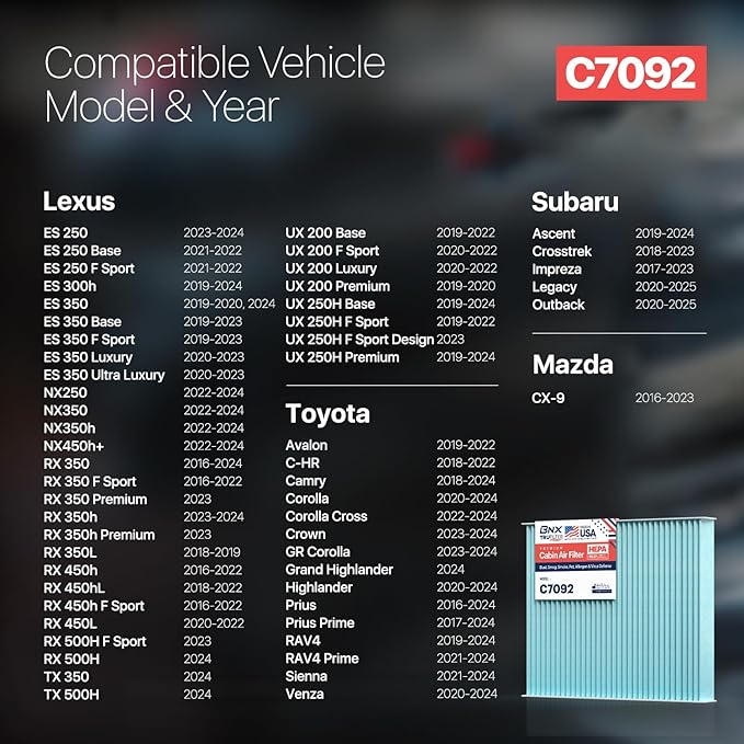 BNX TruFilter C7092 Cabin Air Filter, HEPA 99.97%, MADE IN USA, Compatible with Subaru Crosstrek, Ascent, Impreza, Legacy, Outback, Toyota Prius C-HR, Prius AWD-e, Prius Prime, Corolla, RAV4, Venza