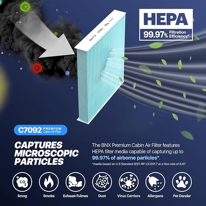 - BNX Cabin Air Filters are designed using 99.97% PFE HEPA meltblown filtration media, based on U.S Standard IEST-RP-CC001.7. The premium BNX cabin filters are proudly manufactured in the U.S. and protect you against harmful microscopic particles such as smoke, smog, mold, bacteria, pet dander and more. (Registration #101638-TX-1)