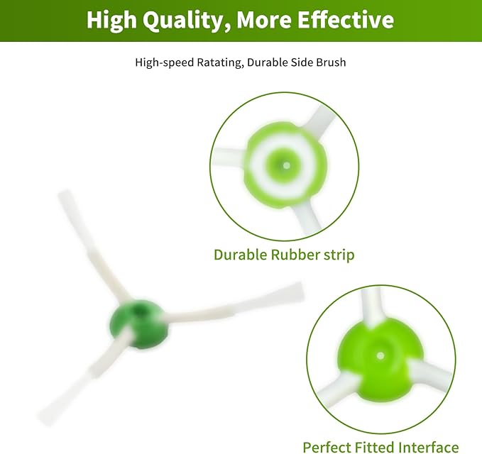 - High Efficiency Filtration Technology:Premium rubber brushes one for removing dirt and the other for cleaning. The side brush penetrates deep into corners and edges to remove more dirt, dust and debris. Roomba filter replacements blocks 99.97% of pollen, dirt, dust, pet hair and other particles as small as 0.3 microns