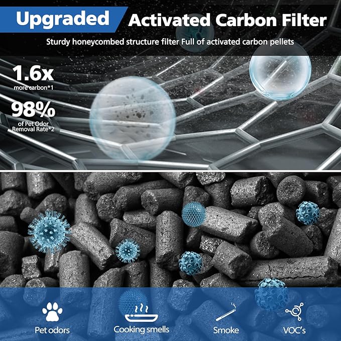 - Idea for Households with Pets: The custom efficienct Vital 200S air purifier filter activated carbon filter layer improves deodorant ability by 60%, helps reduce unpleasant odors and fumes such as smoke, cooking odors, and pet odors, as well as VOCs, which makes it a good choice for homes with pets, cooking, and smokers. Reduce all odors and gases from your home to improve the air quality and your health without worrying about second-hand pollution