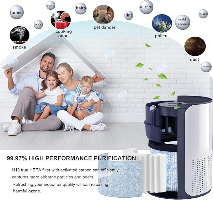 - H13 Grade True HEPA Filter captures up to 99.97% of airborne particles and allergens down to 0.3 microns in size such as smoke, dust, pollen, pet dander