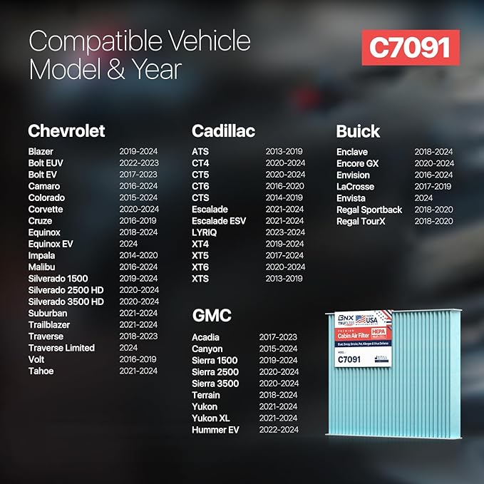 BNX TruFilter C7091 Cabin Air Filter, HEPA 99.97%, MADE IN USA, Compatible With Select Chevrolet: Silverado, Impala, Cruze, Malibu, Traverse, GMC: Sierra, Yukon, Terrain, Buick: Enclave, LaCrosse