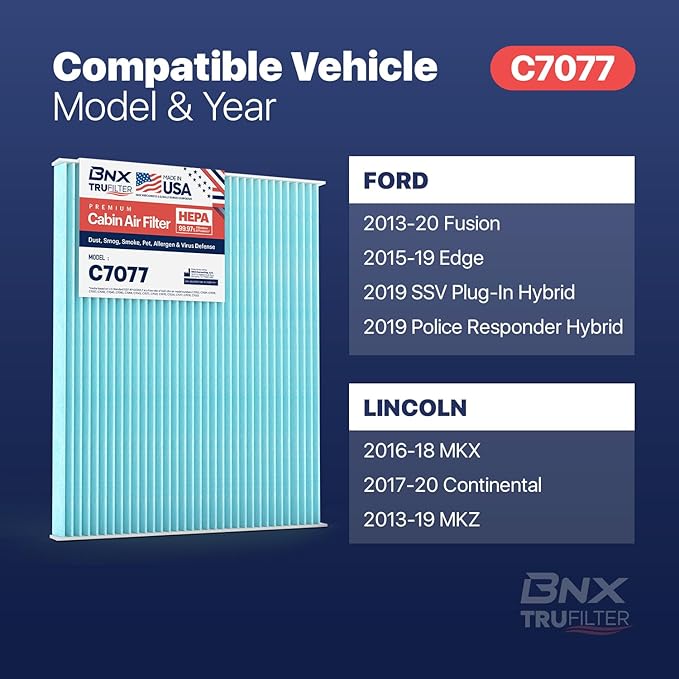 BNX TruFilter C7077 Cabin Air Filter, HEPA 99.97%, MADE IN USA, Compatible With Ford Edge, Fusion, Police Responder Hybrid, SSV Plug-In Hybrid; Lincoln Continental, MKX, MKZ