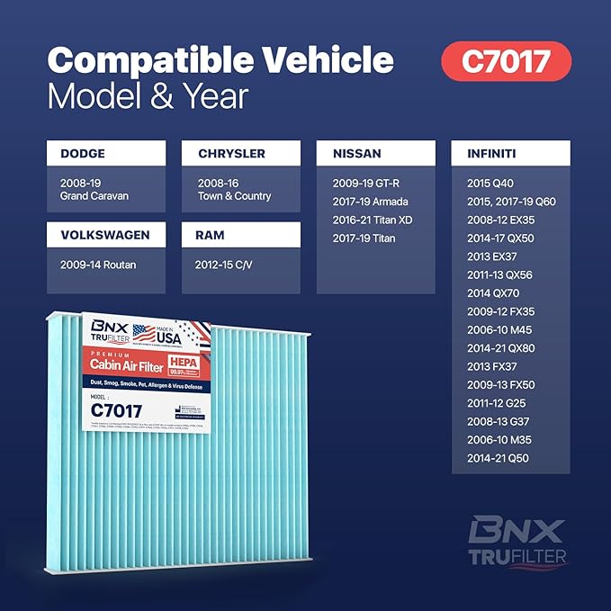 BNX TruFilter C7017 Cabin Air Filter, HEPA 99.97%, Compatible With Select Infiniti EX, FX, G, M, Q, QX; Compatible with Nissan Armada, GT-R, Titan; Ram C/V; Volkswagen Routan