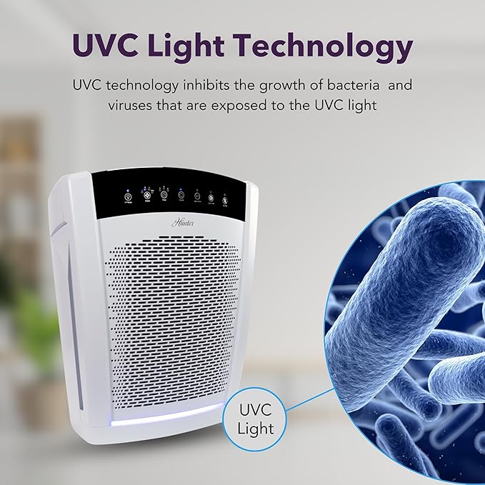 Hunter HP850 Air Purifiers for Home Large Room and Bedroom. True HEPA Air Purifier for Pets, Odors, Allergens, Smoke, Dust. UV Value Bundle w/Extra Filter, Cleans 2585 Ft² per hour. White