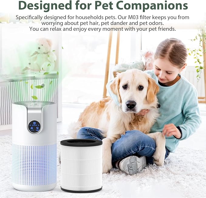 - EFFICIENT AIR FILTER: M03 HEPA filter can filter 99.97% of airborne particles down to 0.3 microns in size, like fine dust, pollen, pet dander, smoke, odors.