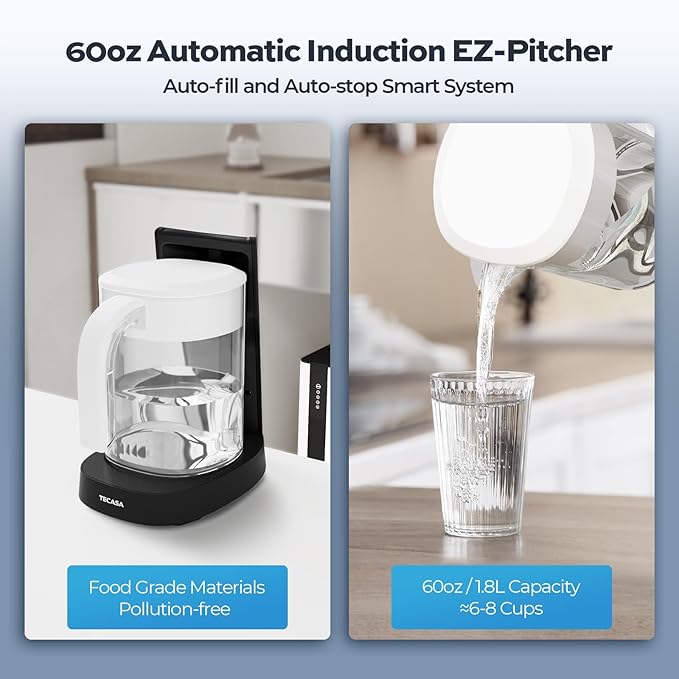 - 【Auto-Fill Reverse Osmosis Water Pitcher】 The 60-oz BPA-free pitcher automatically refills with RO-grade water from your tankless under-sink RO system—no plumbing required. It's perfect for morning coffee, baby formula, cooking,and fits in various places such as apartments, kitchens, outdoor RVs, or boats.