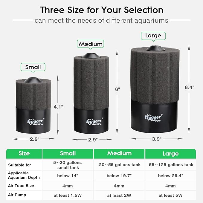 - Three Size For Choice; Small: 2.9"W x 4.1"H, it works pretty well filtration for 5 to 20-gallon small aquariums with under 14” depth. Medium: 2.9"W x 6"H, suggested for 20 to 55-gallon medium-sized aquariums with under 19.7” depth. Large: 3.9"W x 6.4"H, suggested for 55 to 125-gallon aquariums with under 26.4” depth